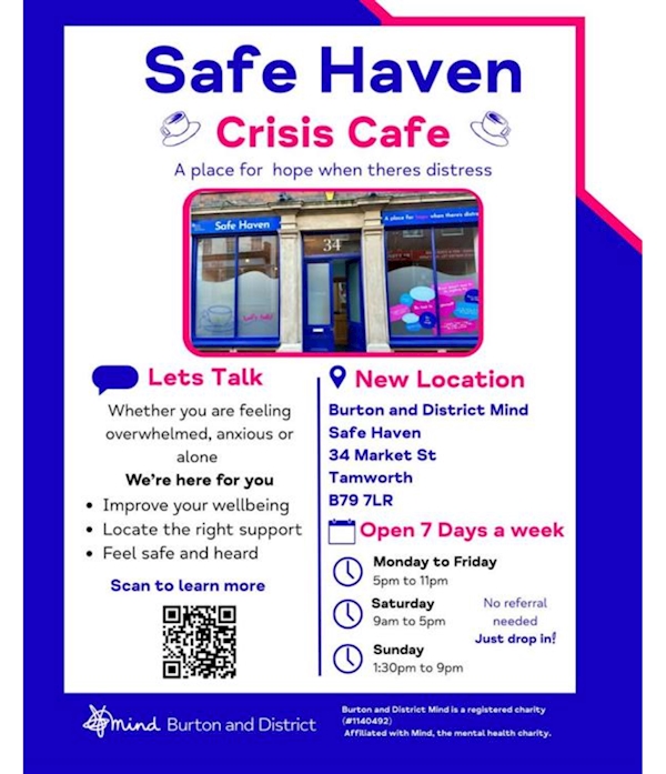 There are plenty of services throughout Tamworth and beyond which can can offer support. One such support is the Safe Haven Crisis Café in Market Street which is open 7 days a week with no referrals need.