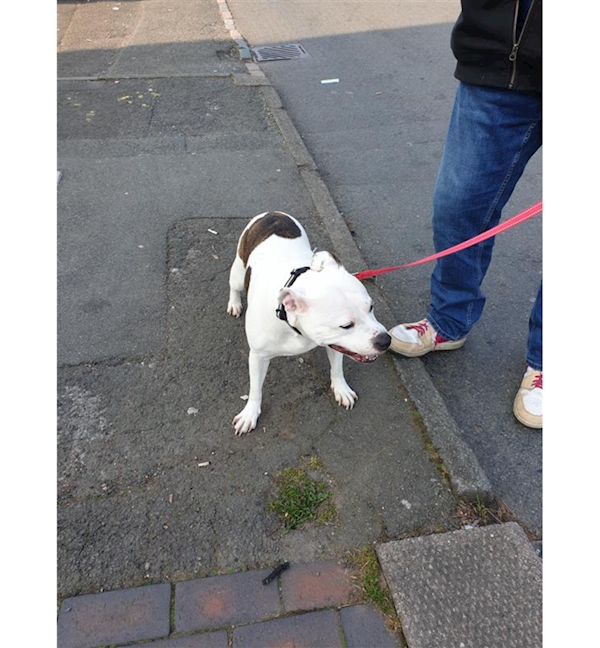 A female Staffordshire bull terrier has been found roaming in Mallorie Road area of Norton this morning.