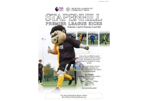 Burton Albion are running a youth football session at Robert Sutton on 8th April, open to Years 7–11. This is a great opportunity for young people to get active, build skills, and enjoy a fun day of football with qualified coaches.